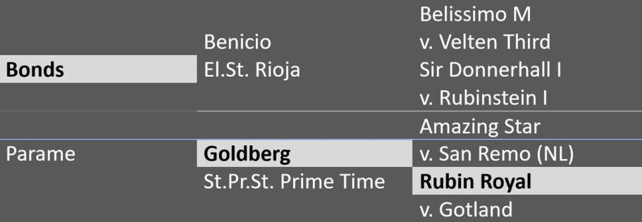 Die Urgroßmutter Primadonna brachte zwei gekörte Hengste und fünf weitere sporterfolgreiche Nachkommen mit Erfolgen bis in den Grand Prix Sport. Ihr Sohn Caprigold war Siegerhengst seiner Körung. Bonds in Gold repräsentiert den weltberühmten „Neustädter P-Stamm“ (Brdbg. Stutenstamm 47/Pauline von Dargardt), aus dem bis heute mehr als 70 gekörte Hengste, darunter die bekannten Bruderpaare Belantis I und II, Quadroneur I und II, Santo Domingo I und II, die gekörten Hengste First Kiss, Quaterstern, Vivconte und zahlreiche mehr hervorgegangen sind. Aushängeschild der Familie war auch die legendäre Poetin I, die unter Kathrin Meyer zu Strohen Bundeschampion und Weltmeisterin der jungen Dressurpferde werden konnte.