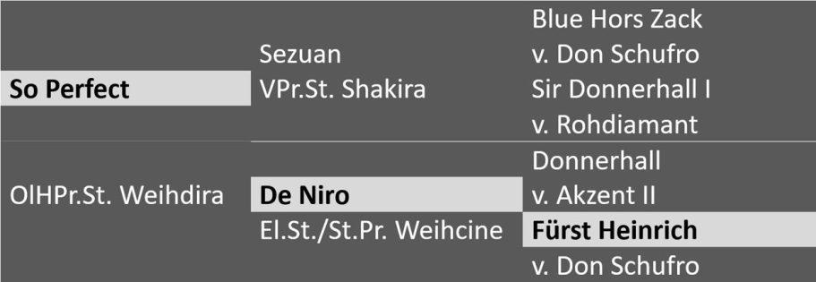 Sie ist auch Schwester zu Weihe’s Hope (v. Sir Donnerhall I), Mutter des KWPN und OL-Prämienhengstes L’ Avenir, zur St. Georg-erfolgreichen Weihcera (v. Zack), Mutter zum WM-Finalisten For Gold OLD, Special Gold PCH (v. San Amour) S-erfolgreich unter Katharina Hemmer und auch zum gekörten und unter Tristan Tucker Intermediaire I erfolgreichen Jewels Sir Weibach (v. Sir Donnerhall I). Als Mutter dieser zahlreichen Ausnahmepferde verantwortlich zeichnet sich die Ausnahmestute Weihegold OLD. Sie war Oldenburger Siegerstute, Burg-Pokal- und Louisdor-Preis-Gewinnerin und unter Isabell Werth Olympia- und dreifache Weltcup-Siegerin sowie vierfache Europameisterin. Der Oldenburger Stutenstamm der Weissena kombiniert mit dem so erfolgsverwöhnten hannoverschen Stamm der Noreja, aus dem So Perfect entstammt, verspricht Leistungsabsicherung auf allerhöchstem Niveau, wie man es nur bei ganz wenigen Hengsten im Deckeinsatz findet.